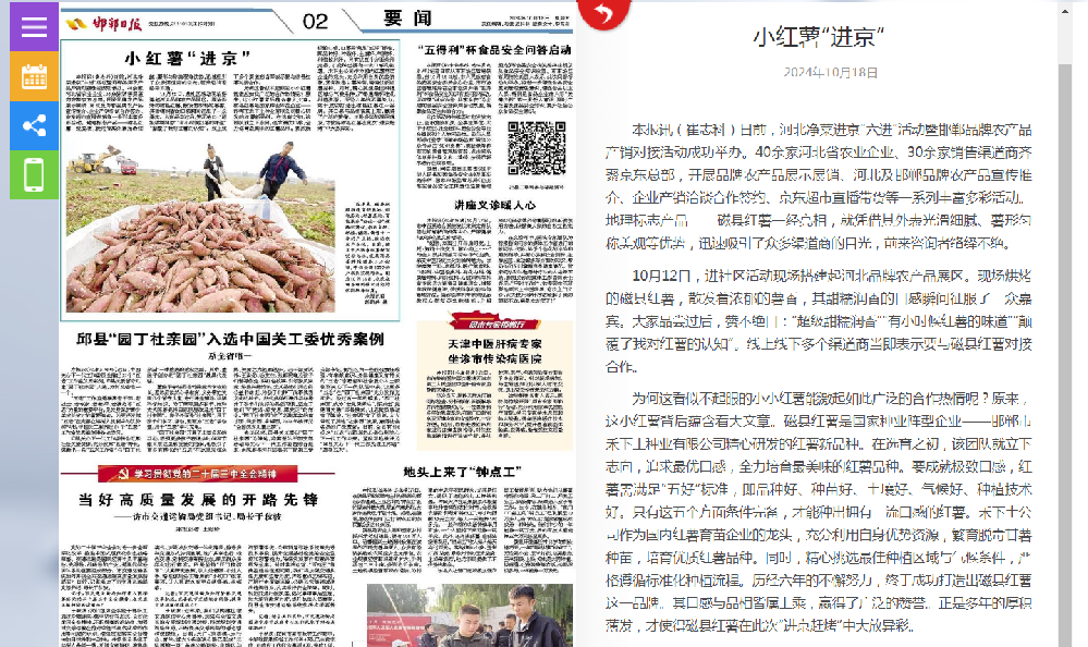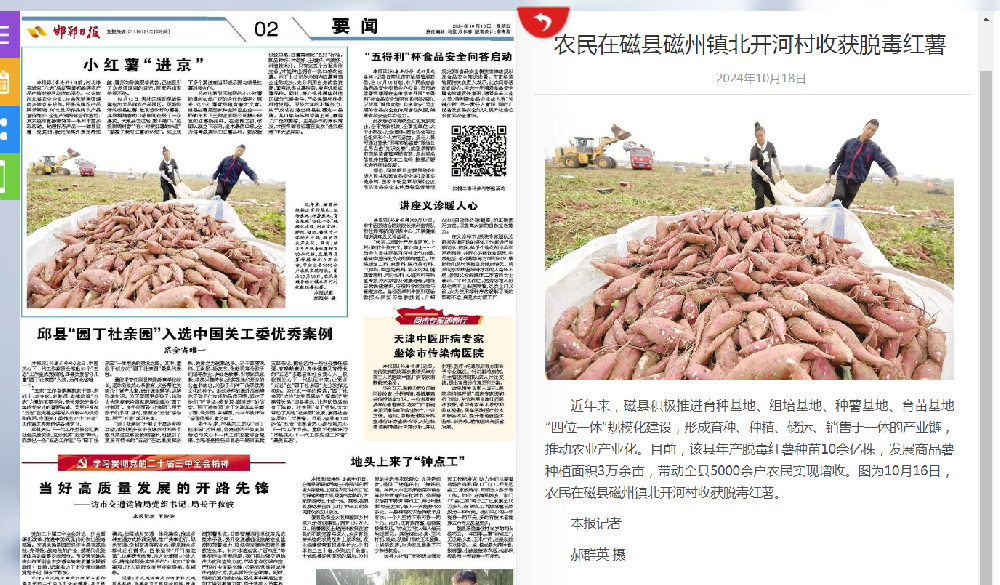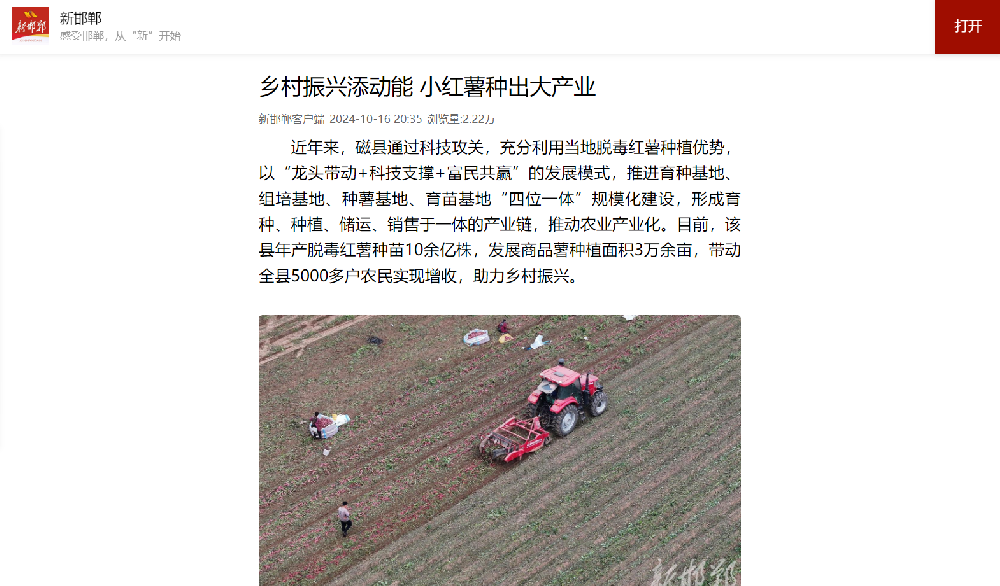 2024年10月16日,邯鄲日?qǐng)?bào)社打造的平臺(tái)級(jí)移動(dòng)客戶端“新邯鄲”,發(fā)布《鄉(xiāng)村振興添動(dòng)能 小紅薯種出大產(chǎn)業(yè)》報(bào)道。該報(bào)道聚焦磁縣脫毒紅薯產(chǎn)業(yè),解析了磁縣這一地方特色產(chǎn)業(yè)的發(fā)展模式、規(guī)?;ㄔO(shè)及對(duì)社會(huì)經(jīng)濟(jì)的積極影響。