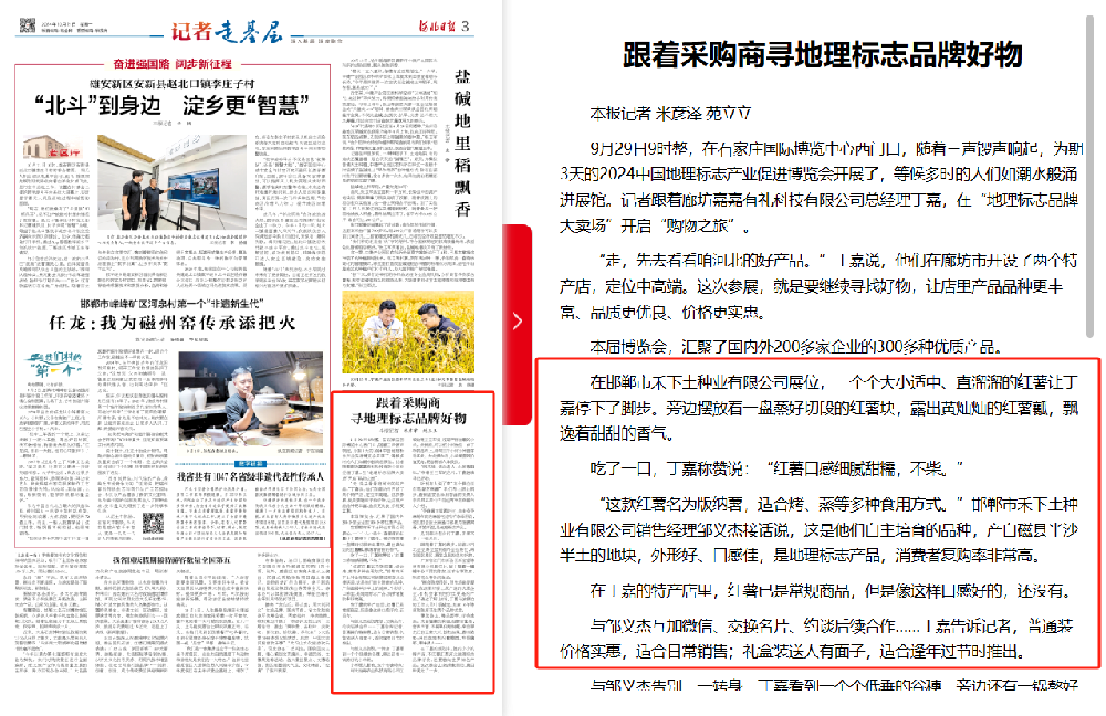 2024年10月21日,河北日?qǐng)?bào)“記者走基層”版塊刊登《跟著采購商 尋地理標(biāo)志品牌好物》,報(bào)道了9月在石家莊隆重舉行的2024中國地理標(biāo)志產(chǎn)業(yè)促進(jìn)博覽會(huì)。這場(chǎng)博覽會(huì)匯聚了國內(nèi)外200多家企業(yè)的300多種優(yōu)質(zhì)產(chǎn)品,其中,邯鄲市禾下土種業(yè)有限公司展出的地理標(biāo)志產(chǎn)品“磁縣紅薯”尤為引人注目。版納薯憑借光滑細(xì)膩的外表、勻稱美觀的薯形以及甜糯潤香的口感,贏得了現(xiàn)場(chǎng)采購商的青睞,并當(dāng)即表達(dá)了與禾下土就“磁縣紅薯”進(jìn)行對(duì)接合作的意愿。