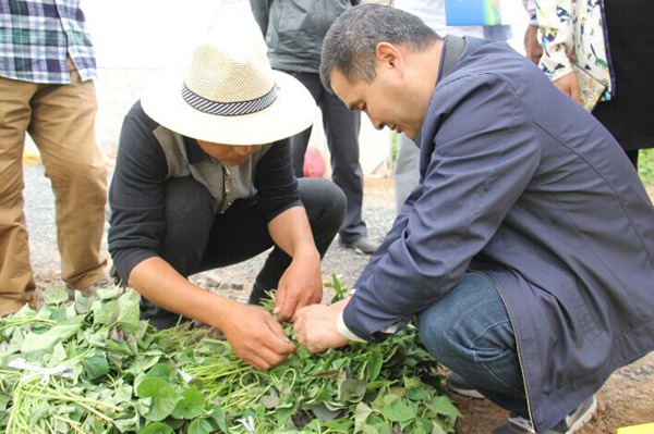 河北日報主任記者趙永輝查看禾下土脫毒甘薯種苗