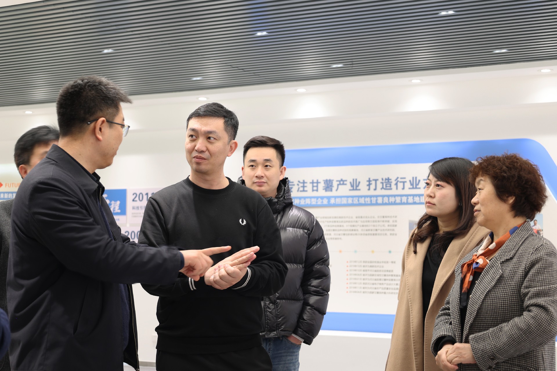 2023年3月3日,京東科技京東云總裁業務助理馬福重、京東科技渠道發展、鄉村振興負責人毛雅慧、宣亞國際營銷科技董事長鄔濤、百度智能云高級解決方案工程師楊揚一行,到邯鄲市禾下土種業有限公司參觀調研。一行先后參觀甘薯綜合展廳、脫毒組培中心。在展廳內董事長王玉文詳細介紹了禾下土在脫毒甘薯種業的創新發展情況,并就公司現階段發展布局、產業品牌化方面問題展開交談,望通過建立合作突破公司現發展瓶頸,馬福重一行對禾下土在技術創新、扶貧攻堅、鄉村產業帶動方面的堅持給予高度贊賞。縣級領導李永清、縣農業農村局、投資促進服務中心同志陪同調研。