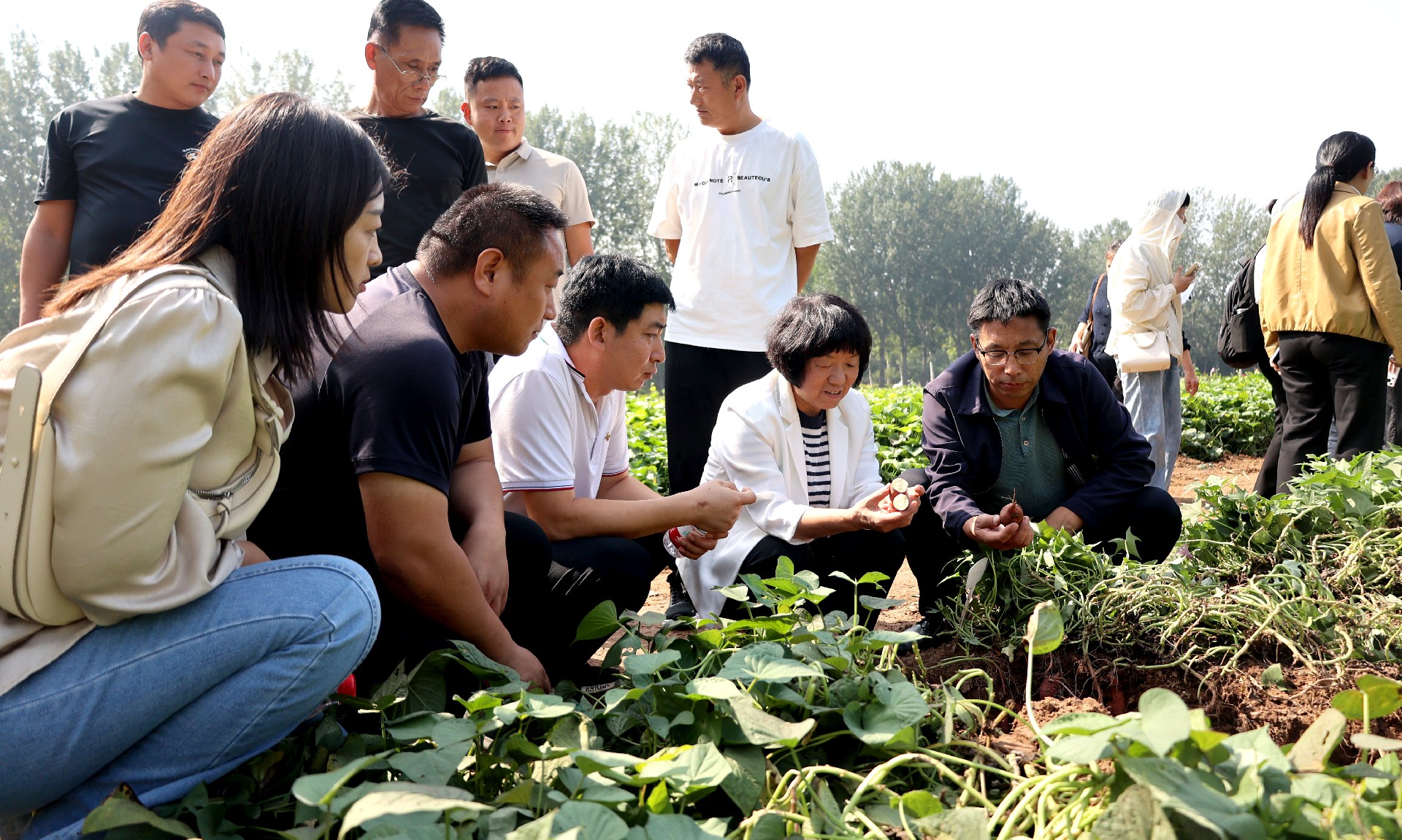 理論的深度,需由實踐的腳步丈量。在專題會議的知識分享環(huán)節(jié)圓滿落幕后,參會眾人前往甘薯新品種試驗基地,大家俯身田間,近距離觀察不同甘薯新品種的生長特性從藤蔓、葉片到土壤下甘薯的狀態(tài),直觀感受品種差異帶來的生長表現(xiàn);同時,圍繞各品類甘薯的核心優(yōu)勢展開詳細介紹,針對淀粉含量、口感甜度、抗逆性等關鍵品種特點逐一解析,明確不同甘薯品種的核心競爭力,讓農戶更加清晰掌握其對應的市場定位與應用方向。隨后,移步至甘薯品鑒區(qū),擺放著70余個甘薯品種,供大家現(xiàn)場品嘗體驗,直觀感受到“好品種”背后的“好品質”。在甘薯機械化高效采收演示現(xiàn)場,觀摩農機作業(yè)全過程,切實感受科技為農業(yè)生產帶來的便捷與高效,進一步加深了對甘薯產業(yè)現(xiàn)代化發(fā)展的認知。