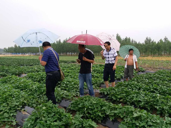 2017年6月22日,河北省農科院糧油作物研究所甘薯室主任、京津冀甘薯聯合鑒定試驗負責人馬志民冒雨到禾下土甘薯新品種試驗基地調研,邯鄲市禾下土種業有限公司總經理崔伏喜陪同參觀。