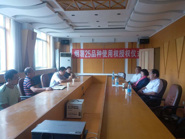 2017年9月11日,邯鄲市禾下土種業有限公司與煙臺市農業科學院在山東煙臺簽定"煙薯25"甘薯品種使用權許可合同,有效日期15年。煙臺市農業科學院授權邯鄲市禾下土種業有限公司"煙薯25"甘薯品種權在審定區域內的使用權,包括生產權、包裝權、經營權和維權。雙方共同對審定區域內生產、銷售煙薯25品種進行宣傳和規范。邯鄲市禾下土種業有限公司在河北省范圍內可以確定營銷、生產合作單位。煙薯25品種使用權合作洽談育種人辛國勝與禾下土公司崔伏喜經理合影留念煙薯25品種使用權授權證書合作雙方人員合影煙臺農業科學院禾下土脫毒煙薯25原種基地