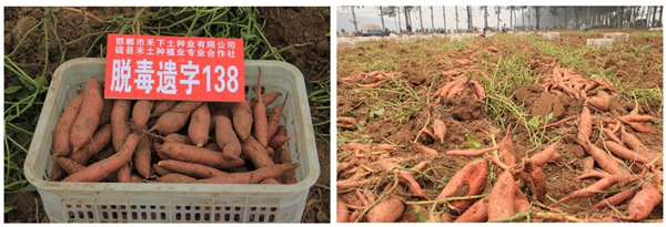禾下土脫毒紅薯高產示范基地占地10000畝,以脫毒紅薯新品種、新技術試驗示范為核心,先后完成高起壟栽培、滴灌、機械化收獲等20余項技術成果轉換。通過組織開展試驗示范、現場觀摩、技術指導、集中培訓等方式,完輻射新增脫毒紅薯種植面積4萬畝,實現紅薯單產提高30%至60%,有效帶動地方紅薯產業的健康發展。